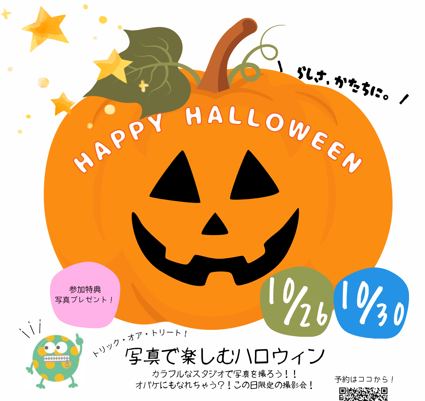 10月といえば・・・・ハロウィン✨ この2日間だけの特別な撮影会はいかがですか? 仮装してオバケにだってなれちゃう?!笑って楽しいちょっと可笑しな撮影会✨ 撮影参加料は、な、な、なんと・・・550円!!参加特典でL版写真プレゼント! ーハロウィン撮影会2025.10.26(日) & 30(木)両日10:00~15:00 最終受付14:30(完全予約制) 対象:どなたでも参加OK!家族と一緒に、お友達となど一緒にご参加ください! ★カラフルスタジオか、黒背景のダークなスタジオの2種類でお選びいただけます。 黒背景で撮影の方は、プレゼント写真にイラストを描いてお渡し👻 服装:自由!仮装してご来店大歓迎!!! 撮影時間:ひと家族様30分参加料:1家族 550円 ※撮影データは別途料金です。データが含まれた撮影会特別セットから、当日はお選びください。 お写真のサンプルイメージは、インスタをご覧いただくか、当日ご案内させていただきます🎵 ご予約はこちらから! 又は下記QRコードからお願い致します♪ ←ご予約はこちらのQRコードからどうぞ! お問い合わせは、お電話もしくはお問い合わせフォームにてご連絡下さいませ。 ☎ 0857-22-0222(定休日:水)