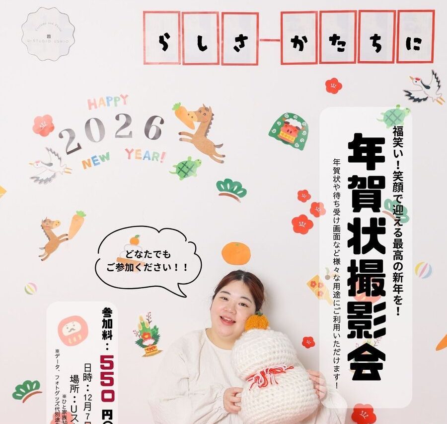 年賀状撮影会 開催!! 今年も残すところあと2ヶ月程。今年のやり残したことはございませんか?? 10月好評だった500円撮影会を12月も開催⭐⭐ 12月第一弾は、、、、、年賀状撮影会! 毎年、年賀状を作る方も、作らない方もどなたでも楽しめる撮影会です! 撮影写真をおうちに飾るもよし、データで残して待ち受け画面やお友達に新年のあいさつと一緒に写真を送ろう!! ー笑う門には福来る★年賀状撮影会 日程:12/7(日) 10:00~ ※1家族30分毎 ※要予約 場所:Uスタジオウシオ 🅿6台完備 参加料:550円(税込) ※データやフォトグッズで残されたい方、撮影会特別セットあり(別途料金) 撮影対象:家族、カップル、ペットと…どなたでも参加OK! 服装:お好きな服でご参加ください⭐ ー注意事項ー ・ひと家族30分 予約制 ・当日背景をお選びいただけます!※ハガキ風背景orフラワースタジオのどちらか ・店内撮影禁止させていただいております。ご協力の程お願い致します🙇♀️ ・アニバーサリー撮影との併用の場合、22000円が追加となりますのでご希望のお客様はお申し出下さい。 ・参加料にプラスして、フォトグッズやデータで写真を残していただけます。※3300円~💁♀️ 皆さまのご参加お待ちしております!!! Instagramで撮影会イメージ写真、お得な情報配信中!! ➡ @ustudioushio_photo ご予約フォームはこちら♪ 下記QRコードからもご予約可能です↓ その他、お問合せはお電話かHPのお問合せフォームにてご連絡下さいませ。 ☎ 0857-22-0222(定休日:水)