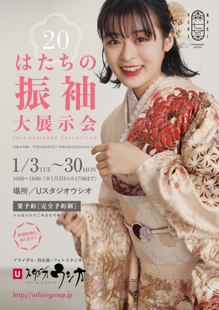 2024年度、新成人の方向けの【新作振袖展示会】を開催いたします! 新作振袖を多数展示しておりますので、ご家族でご試着にお越し下さいませ! ※ご予約様優先(前日まで予約受付可能) ー 展示会開催期間:2023年 1月3日(火)~1月30日(月)10:00~18:00(1月3日のみ17時まで) 対象:平成15年4月2日~平成16年4月1日生まれの方 ー 振袖一式12点フルセット44,000円(税込)からご覧頂けます。 ご自前振袖で撮影のみご検討の方も、小物のみのレンタルで今風にアレンジされたい方も、 その他ご要望も、ご対応可能です。 是非お気軽にご相談くださいませ! ご予約またはお問合せは、お電話かお問合せフォームにてご予約下さい。 ☎ 0857-22-0222 ー