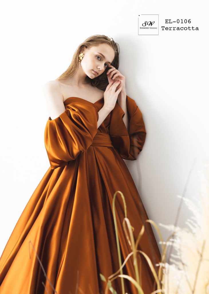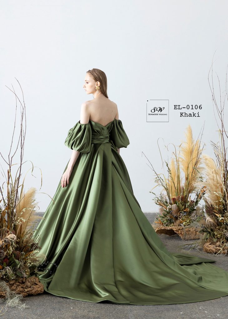 ー 上質なサテンが美しい光沢を放つカーキとテラコッタオレンジのカクテルドレス。NYやヨーロッパ海外ブランドでトレンドのドロップパフスリーブが、 シンプルなデザインに相性抜群でお洒落花嫁様に人気です。パフスリーブは取り外して2WAYでご着用する事も可能。身頃はインポートのように大胆なカッティングのハートネックになっていますが、しっかりと胸元を包み込むようにカシュクールにすることで、安定したネックラインに仕上がるようになっております。バックスタイルは、身頃に合わせたバッスル&カシュクールで動きを加えたデザイナーのこだわりの詰まったクチュール感のあるデザインドレスとなっております。