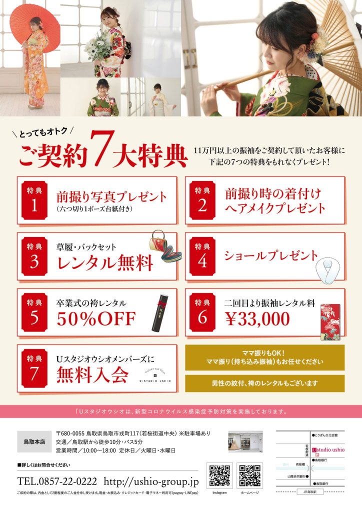 2025年度、新成人の方向けの【新作振袖展示会】を開催いたします! 新作振袖を多数展示しておりますので、ご家族でご試着にお越し下さいませ! お話のみのご来店でも勿論大歓迎!! ※ご予約様優先(前日まで予約受付可能) ー 展示会開催期間:2024年 3月8日(金)~3月31日(日)10:00~18:00 対象:平成16年4月2日~平成17年4月1日生まれの方 ー 振袖一式12点フルセット44,000円(税込)からご覧頂けます。 ご自前振袖で撮影のみご検討の方も、小物のみのレンタルで今風にアレンジされたい方も、 その他ご要望も、ご対応可能です。 是非お気軽にご相談くださいませ! ご予約またはお問合せは、お電話かお問合せフォームにてご予約下さい。 ☎ 0857-22-0222 ー