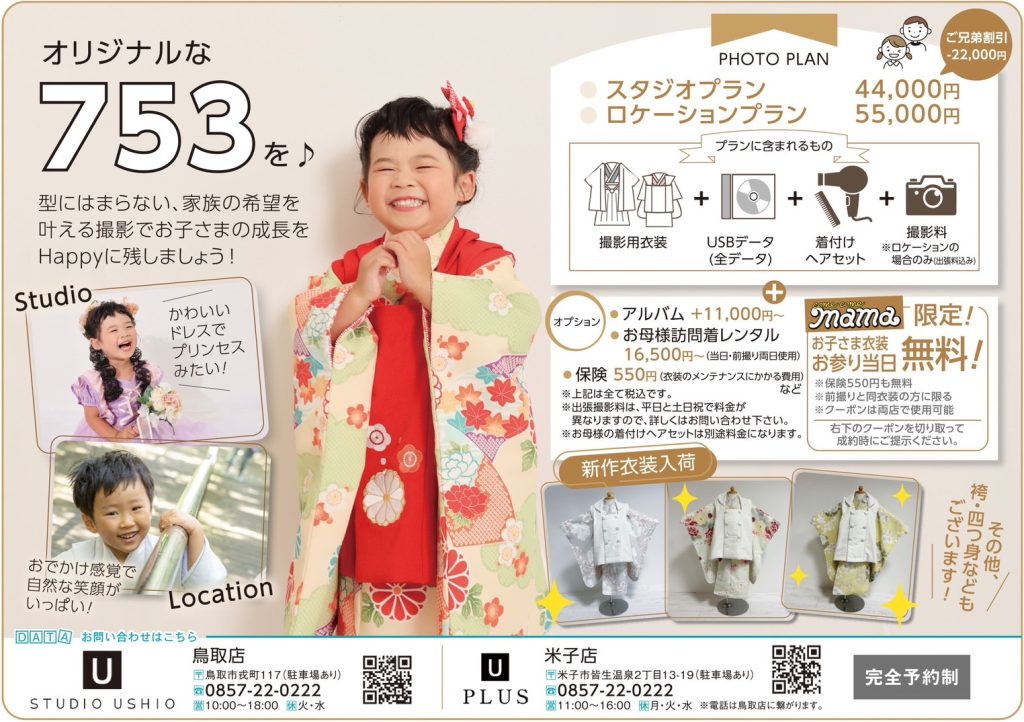 フリーペーパーのカムカムママに七五三撮影プランを掲載中です‼ 8月末まで有効の無料クーポンをご持参して、お衣裳をお得にレンタルして頂けますよ!👘 今トレンドの女の子のくすみ系テイストで可愛いお着物が入荷しております! お日にちに空きございますので、スムーズにご案内させていただけます今の時期に、 是非ご試着にお越し下さいませ! 鳥取本店・米子店の両店でご利用可能でございます。 プラン内容は下記サイトよりご覧いただくか、直接お電話くださいませ☟ ー ☎0857-22-0222(定休日:火・水)