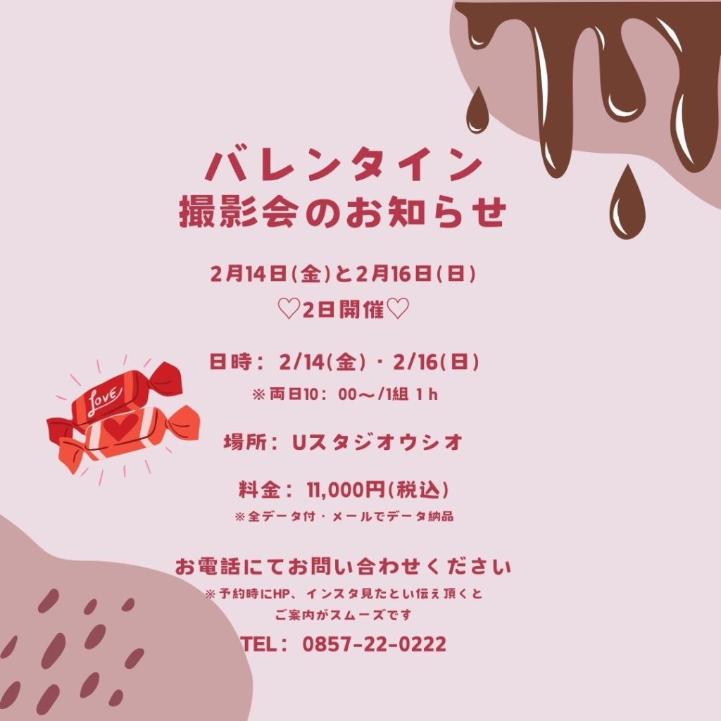 バレンタイン時期にちなんだ撮影会を開催いたします!テーマは“バレンタイン”なので、バレンタインらしいセットでの撮影会を予定しております^^♥♡ ーバレンタイン撮影会2025.2.14(日)・16(日)10:00~16:00(要予約・所要時間 1時間以内)撮影料金:11,000円(撮影全データ付(メールにてご納品)) ご予約またはお問合せは、お電話かお問合せフォームにてご連絡下さいませ。 ☎ 0857-22-0222