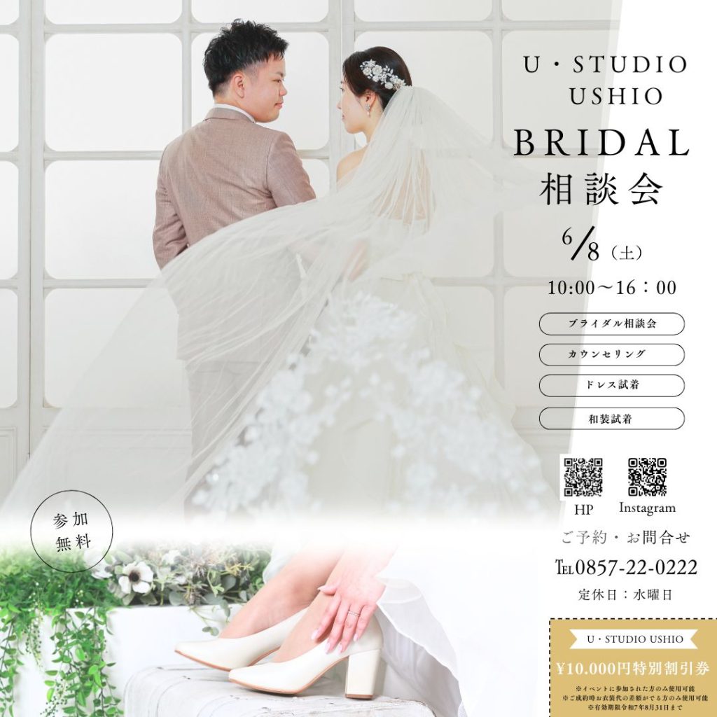 ―in U studio ushio― ― 6月8日(日)に開催させていただきますブライダル相談会では、ドレスや和装のご試着体験ができるブライダル相談会を開催させていただきます! ー カップル様で、結婚はまだイメージに無いけど衣裳の試着はしてみたい!や、今後ご結婚を考えている方など、結婚が決まったばかりで「分からないことが分からない」状態の方も大丈夫! 丁寧にお悩みをお伺いさせて頂きます。 当日ご来店いただいたご新郎ご新婦様には特典をプレゼント☆ お衣裳の試着ができるこの機会に、是非いらして下さいませ✨ ー 日程2025/6/8(日)会場:Uスタジオウシオ時間10:00~16:00(1時間ごとのご予約となります。完全予約制) 内容・フォトウェディングのご相談・結婚式(会場等)のご相談・カウンセリング・ドレスご試着体験・和装ご試着体験【ご来店特典プレゼント】¥10,000特別割引券をプレゼント!イベントにご参加されたお客様のみ後日ご使用可能な特別割引券をプレゼントいたします!