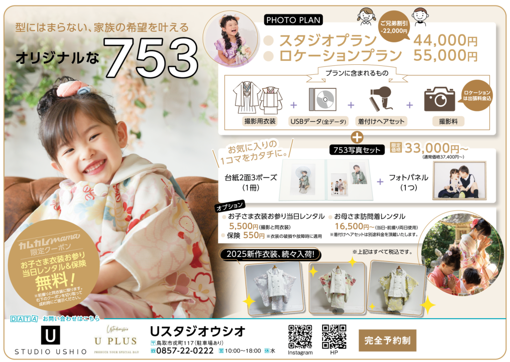 現在、フリーペーパーのカムカムママにて七五三撮影プランを掲載中‼ カムカムママに付いている無料クーポンをご持参して、お衣裳をお得にレンタルして頂けるキャンペーンを実施中!👘 トレンドの女の子のくすみ系テイストで可愛いお着物が入荷しております! まだお日にちに空きのある今の時期に、是非見学にお越し下さいませ! 鳥取本店・米子店の両店でご利用可能。 七五三アルバムセットで、お子様の記念を残しませんか?📖 詳しいプラン内容は下記サイトよりご覧いただくか、直接お電話、またはお問い合わせフォームにてお問い合わせくださいませ☟ 753 ー ☎0857-22-0222(定休日:水)
