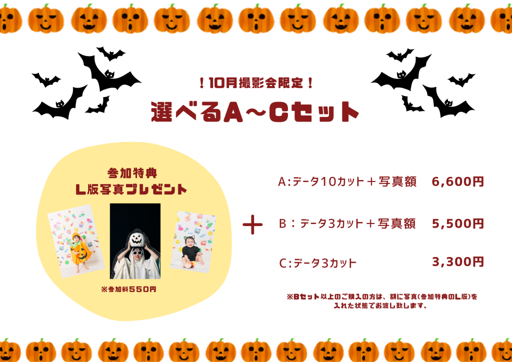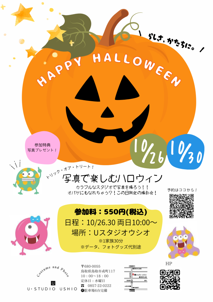 10月といえば・・・・ハロウィン✨ この2日間だけの特別な撮影会はいかがですか? 仮装してオバケにだってなれちゃう?!笑って楽しいちょっと可笑しな撮影会✨ 撮影参加料は、な、な、なんと・・・550円!!参加特典でL版写真プレゼント! ーハロウィン撮影会2025.10.26(日) & 30(木)両日10:00~15:00 最終受付14:30(完全予約制) 対象:どなたでも参加OK!家族と一緒に、お友達となど一緒にご参加ください! ★カラフルスタジオか、黒背景のダークなスタジオの2種類でお選びいただけます。 黒背景で撮影の方は、プレゼント写真にイラストを描いてお渡し👻 服装:自由!仮装してご来店大歓迎!!! 撮影時間:ひと家族様30分参加料:1家族 550円 ※撮影データは別途料金です。データが含まれた撮影会特別セットから、当日はお選びください。 お写真のサンプルイメージは、インスタをご覧いただくか、当日ご案内させていただきます🎵 ご予約はこちらから! 又は下記QRコードからお願い致します♪ ←ご予約はこちらのQRコードからどうぞ! お問い合わせは、お電話もしくはお問い合わせフォームにてご連絡下さいませ。 ☎ 0857-22-0222(定休日:水)