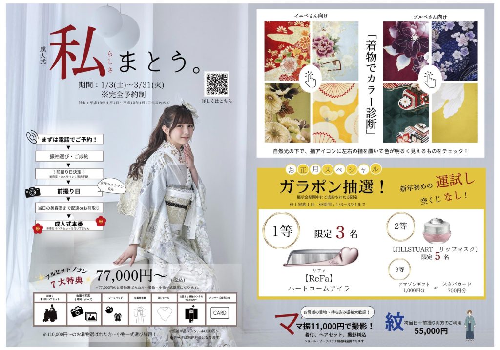 2027年度、新成人の方向けの【新作振袖展示会】を1月より開催いたします! 新作振袖を多数展示しておりますので、ご家族でお越し下さいませ! お話のみのご来店でも勿論大歓迎!! ※ご予約者様優先(前日まで予約受付可能) ー 展示会開催期間:2026年 1月3日(土)~1月31日(土) 10:00~18:00 対象:平成18年4月2日~平成19年4月1日生まれの方 ※1月3日の営業時間のみ、17時までとなっておりますのでご留意ください。 ー 振袖一式12点フルセット44,000円(税込)からご覧頂けます。 ご自前振袖で撮影のみご検討の方も、小物のみのレンタルで今風にアレンジされたい方も大歓迎! お正月スペシャル ガラポン抽選を開催!! 展示会開催期間中にご成約して頂いた方限定で、ガラポン抽選会にご参加頂けます! 空くじなしで、期間は1/3~3/31までとなります!! ー その他ご要望も、ご対応可能です。是非お気軽にご相談くださいませ! ご予約またはお問合せは、お電話かお問合せフォームにてご予約下さい。 ☎ 0857-22-0222 ー