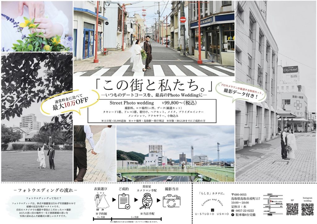 【1月・2月だけの特別プラン】 普段のフォトウェディングとは違った、ストリートスナップ撮影ができる特別なフォトウェディングプラン! ー ーご利用条件ー ☆ストリートスナップの撮影プランとなりますので、ロケーション場所が鳥取駅~県庁周辺をご希望のお客様 ☆ご成約を2026年2月28日迄にご成約のお客様限定 ※撮影は上記期間以外でも問題ございません。 ー ーフォトウェディングPlan内容ー 新郎様タキシード・新婦様ウェディングドレス各1点、新郎様着付け・ヘアセット、新婦様着付け・ヘアメイク、ブライダルインナー・小物セット、新郎様シャツ・小物セット、ロケーション撮影料(撮影場所1ヶ所)、厳選データカット数 ※土日祝日料金・アルバム・全データへのご変更は別途となります。 ー お問い合わせはお電話か、お問い合わせフォームよりお問合せ下さい。 ☎0857-22-0222