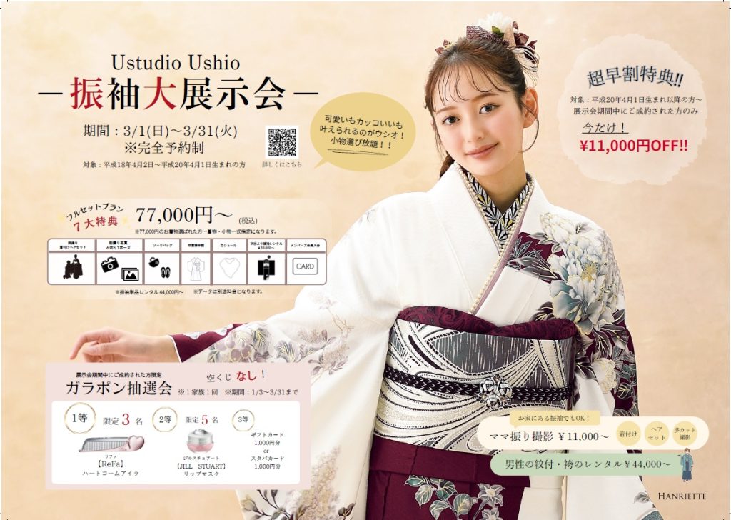 2027年度・2028年度、新成人の方向けの【新作振袖展示会】を3月も引き続き開催しております! 新作振袖を多数展示しておりますので、ご家族でお越し下さいませ! お話のみ・ご見学のみのご来店でも勿論大歓迎!! ※ご予約者様優先(前日まで予約受付可能) ー 展示会開催期間:2026年 1月3日(土)~3月31日(火) 10:00~18:00 2027年度対象:平成18年4月2日~平成19年4月1日生まれの方 2028年度対象:平成19年4月2日~平成20年4月1日生まれの方 ★超!早割特典!!★ 令和10年度の成人振袖を展示会期間中にご成約の方に限り、振袖料金から11,000円早割が適用になります!! ー 振袖一式12点フルセット44,000円(税込)からご覧頂けます。 ご自前振袖で撮影のみご検討の方も、小物のみのレンタルで今風にアレンジされたい方も大歓迎! お正月スペシャル ガラポン抽選を開催!! 展示会開催期間中にご成約して頂いた方限定で、ガラポン抽選会にご参加頂けます! 空くじなしで、期間は1/3~3/31までとなります!! ー その他ご要望も、ご対応可能です。是非お気軽にご相談くださいませ! ご予約またはお問合せは、お電話かお問合せフォームにてご予約下さい。 ☎ 0857-22-0222 ー